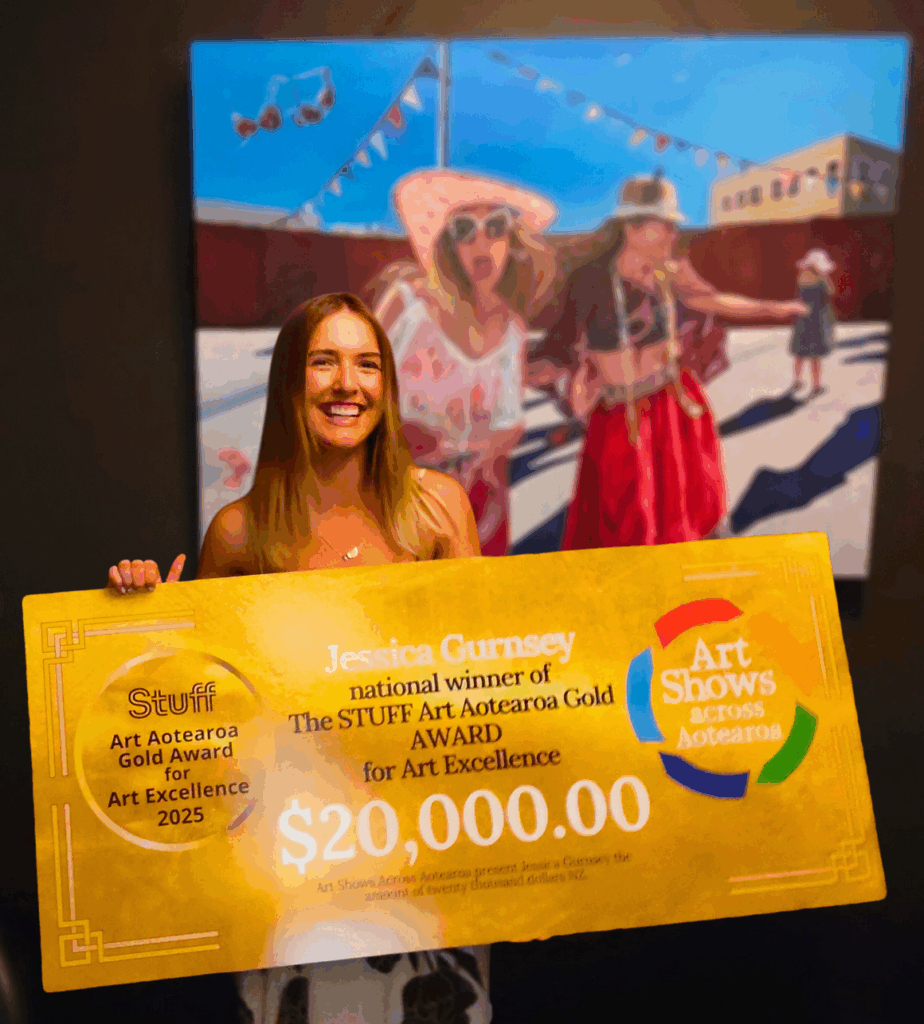 A huge congratulations to the 2025 Stuff Gold Art Aotearoa Award winner, Jessica Gurnsey. Jessica was selected as the Regional Finalist for the Auckland show with her artwork ‘Ticket to Womanhood’, chosen by judges Bob Kerr and Frances Morton, alongside the public vote which placed her in the running for the ultimate 2025 national winner.